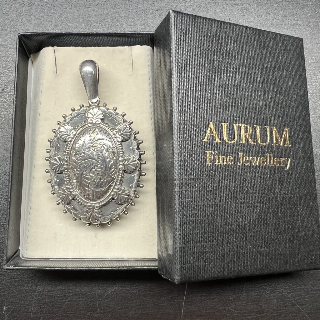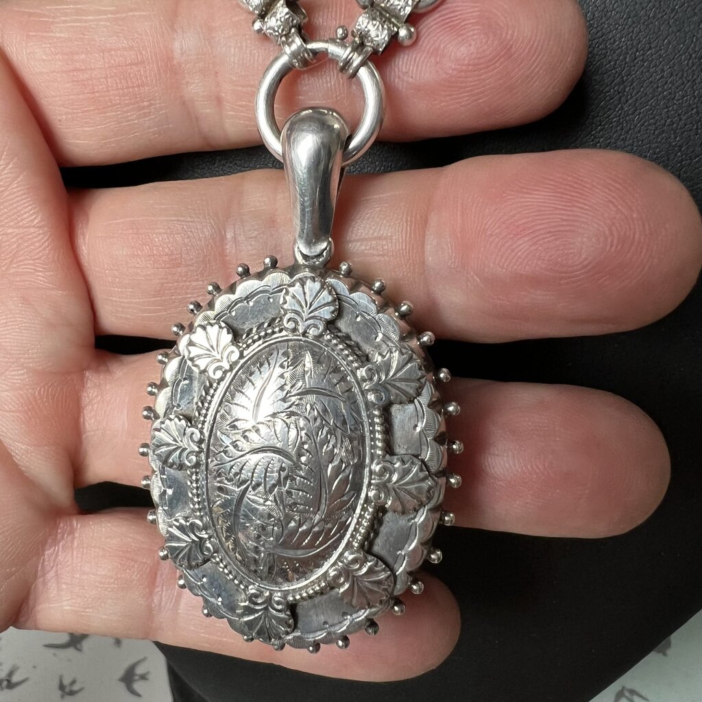 This stunning Victorian silver locket from the aesthetic period features a domed engraved centre with a shell design around. The central engraving is of ferns which were must studied and admired in this period. Traditionally, the Victorians used flowers and leaves as a secret language conferring messages through symbolism on gifts of jewellery etc. In this context ferns may symbolise fascination, sincerity and humility. The locket edge has small balls and the reverse is plain and bears the hallmark. The top bale has a support hallmark as do the internal the rims. The original glass is missing and replaced with perspex. The locket was hallmarked in Birmingham in 1884 (k). The makers mark is F